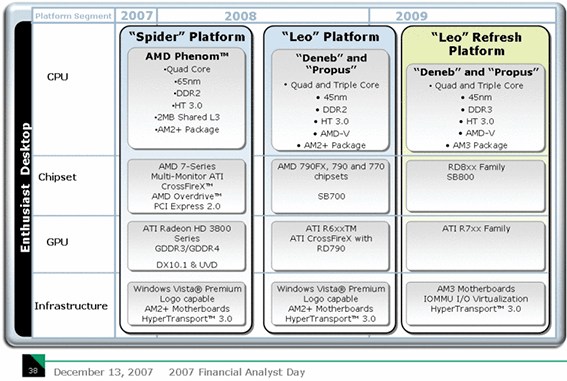 | Восьмиядерные процессоры Opteron выйдут в 2009 году Представители AMD при любой возможности стараются внушить общественности мысль, что компания воздерживается от неразумных соревнований типа "гонки техпроцессов" или "многоядерной войны", которые затевает Intel. Между тем, вчера компания AMD совершенно чётко озвучила планы по выпуску 45 нм процессоров Opteron с восемью ядрами в 2009 году. Они получили кодовое обозначение Montreal, и могут существовать в четырёхъядерном варианте. Если сам по себе факт их подготовки к анонсу для нас большим сюрпризом не стал, то технические характеристики процессоров Montreal подробно описываются впервые. В частности, мы узнаём, что каждое из ядер Montreal будет иметь 1 Мб кэша второго уровня, процессор также будет оснащаться шестью или двенадцатью мегабайтами кэша третьего уровня. Встроенный контроллер памяти получит поддержку DDR-3, что повлечёт смену конструктивного исполнения процессора на Socket G3. Процессоры Montreal наконец-то обретут поддержку HyperTransport 3.0, которой и Barcelona, и её 45 нм последователь по имени Shanghai пожертвовали ради лучшей совместимости с существующими платформами. Число каналов шины HyperTransport в процессорах Montreal увеличится с трёх до четырёх. Что характерно, мы опять замечаем, что в сегменте high-end графики никаких изменений до 2009 года AMD не планирует. Только в составе платформы Piranha на базе процессоров Montreal впервые появляется флагманский продукт по имени R700, который в данном случае будет трудиться в составе профессионального графического ускорителя. Настольная платформа Leo для энтузиастов получит 45 нм процессоры с тремя или четырьмя ядрами во второй половине 2008 года, причём в 2009 году они обретут поддержку DDR-3 и конструктивное исполнение Socket AM3. Другими словами, AMD может наделить первые 45 нм процессоры конструктивным исполнением Socket AM2+ и поддержкой лишь памяти типа DDR-2. Двухъядерные 45 нм процессоры Regor будут существовать только в исполнении Socket AM3, обеспечивающем поддержку DDR-3. Они тоже выйдут в 2009 году. Ранее считалось, что процессоры в исполнении Socket AM3 будут одновременно поддерживать и DDR-2. Вряд ли планы AMD с тех пор изменились. Четырёхъядерные процессоры Deneb сохранят кэш третьего уровня, а процессоры Propus его лишатся. Трёхъядерные 45 нм процессоры фигурируют на слайдах под кодовым именем Heka. Источник Автор:Lexagon